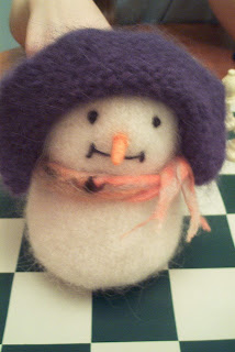 I felted something I had lying around and turned it into this: A hat that covers the ears for the snowman (well it would cover his ears, if he had any!) ... reminiscent of the postman in the film "Jingle All the Way." Or maybe it could be like a Napoleon-style hat if I bring up the sides a little more ... Here is snowman in a felted sombrero! All I need are a few inches of ball fringe to trim it with.