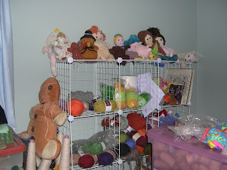 I bought wire, stackable crates from Target, which are great for yarn ... and moved the big teacher's desk, some bookcases and the glass-top patio table (that had been at my parents' house), as well as an armchair into this room. It's a lot of furniture for the space, but I need it!