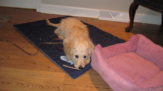 Getting used to her Mutt Mat. I love this! I just say, "GO TO MAT" and she looks at me for a moment or two and then goes to her mat!!! I tried it outside this morning, but we're not ready for that. Too many distractions ... children laughing; airplane overhead; birds singing; trash cans being rolled up; etc. I have hope, though! Eventually, she's supposed to focus on me and not the distractions.